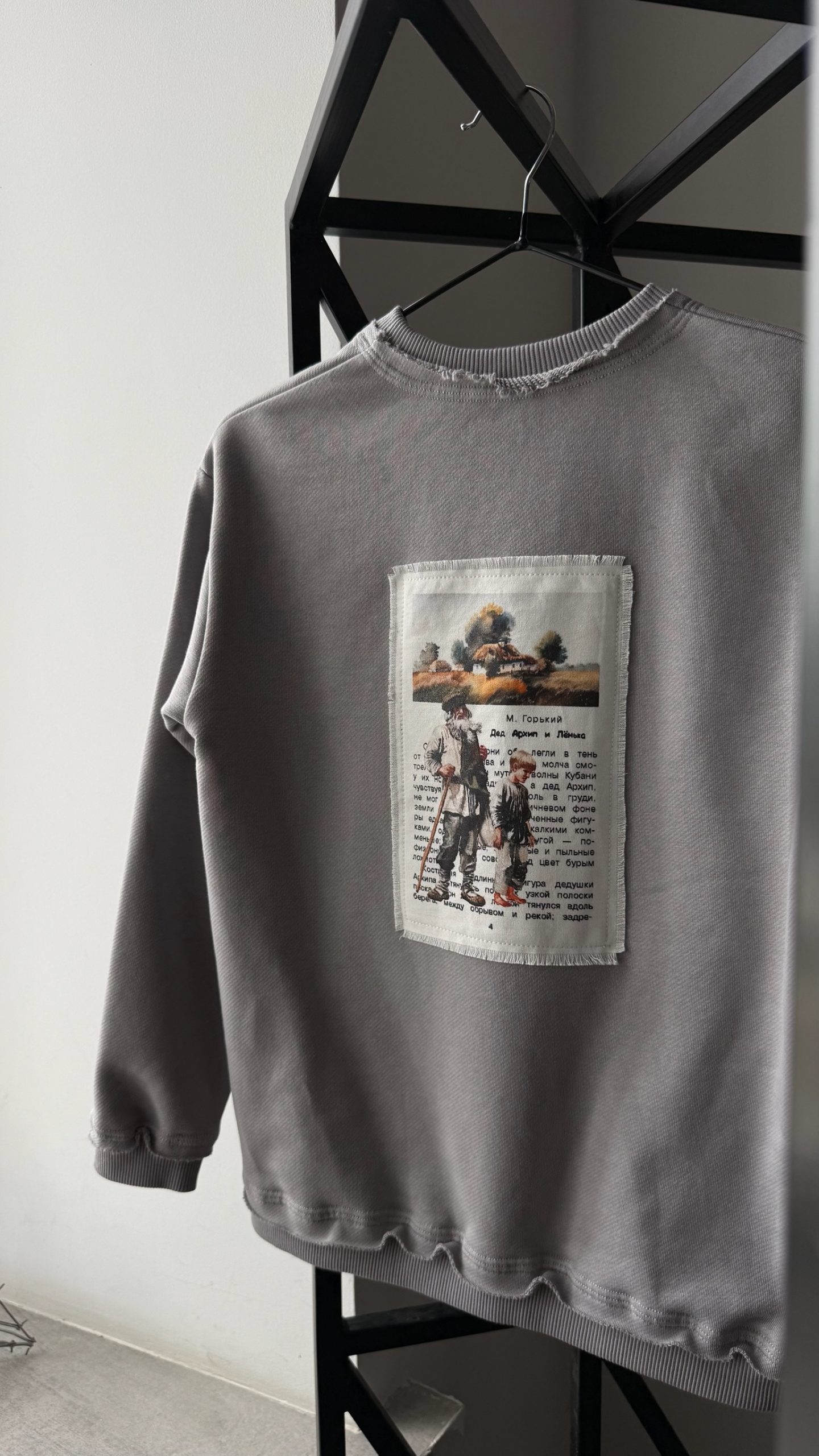 · Носимая литература: Уникальная шелкография в виде страницы из первого издания рассказа «Дед Архип и Ленька» — стильная и глубокая деталь, пробуждающая интерес к русской классике.