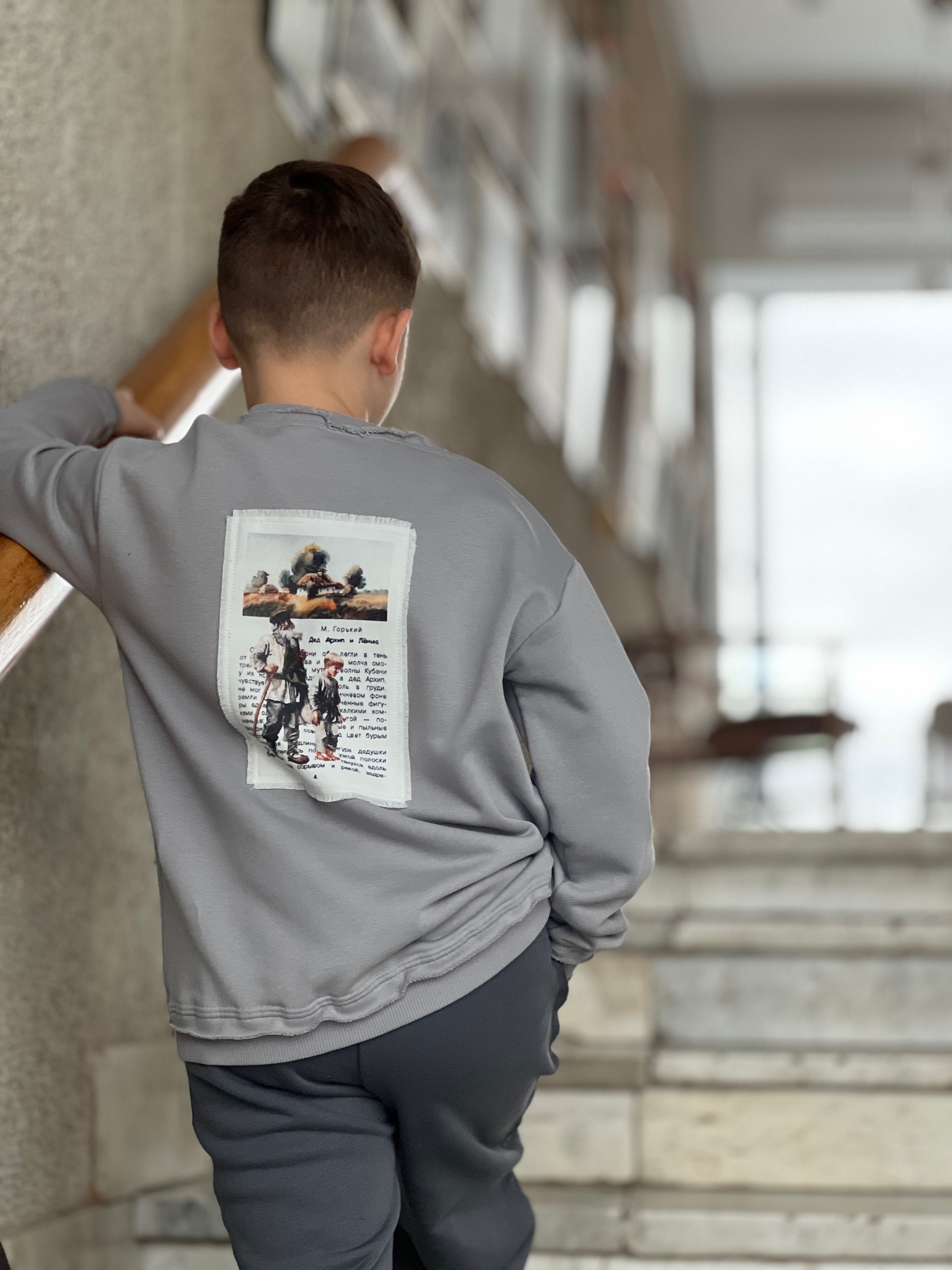 Костюм, который рассказывает историю. Вдохновленный суровой поэзией повести Максима Горького, этот комплект из серого футера с шелкографией страницы оригинала станет не просто одеждой, а первым изданием в гардеробе вашего ребенка. Необработанные края и лаконичный дизайн подчеркивают глубину и искренность классической литературы.